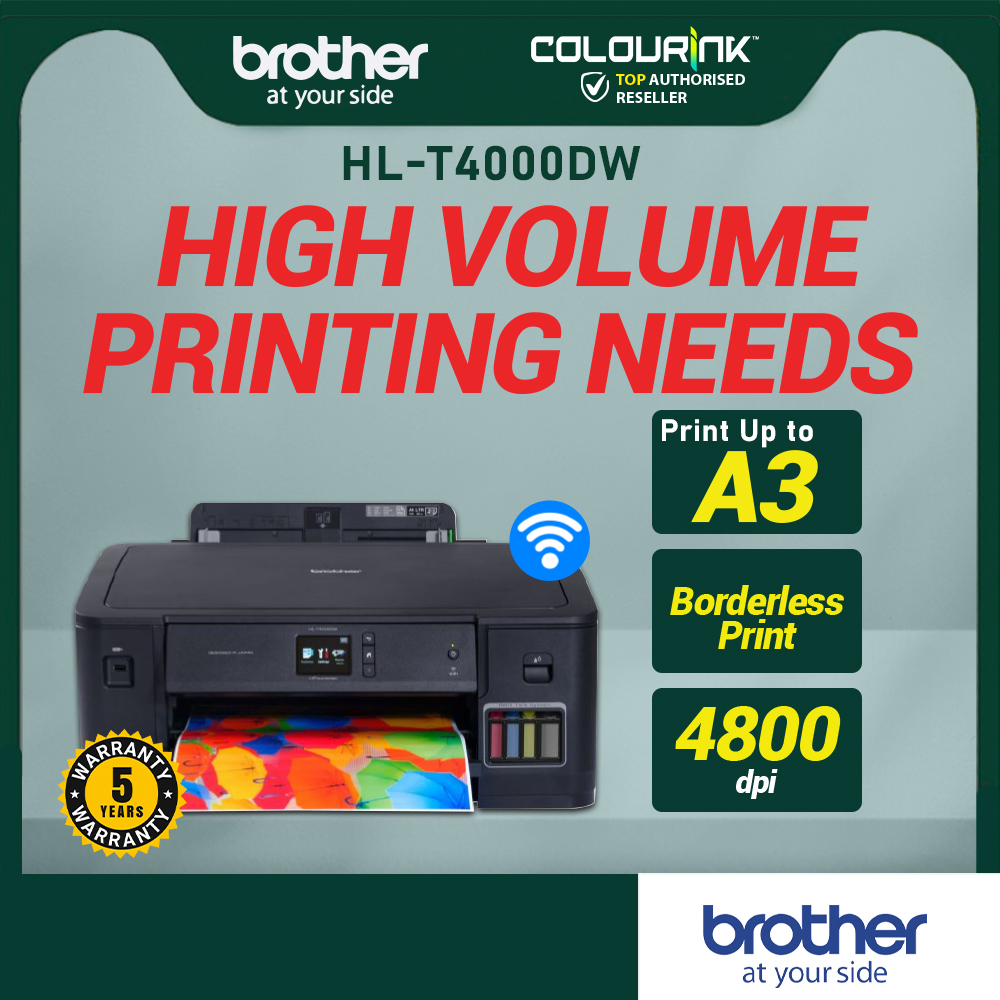 A high-performance A3 refillable ink tank printer tailored for home offices and small businesses. It offers fast ISO speeds of 22 ppm (mono) and 20 ppm (colour), auto duplex A3 printing, and ultra-low running costs thanks to high-yield ink bottles (6,500 B/W & 5,000 color pages). With 1200×4800 dpi resolution, USB/Ethernet/Wi‑Fi/Wi‑Fi Direct connectivity, and versatile paper handling (250‑sheet tray + 100‑sheet MP), this printer delivers sharp photo-quality prints in sizes up to A3 at half the cost of standard inkjets. Finished with a 2.7″ touchscreen and robust security features for multi‑user environments, the HL‑T4000DW combines productivity, quality, and economy.
